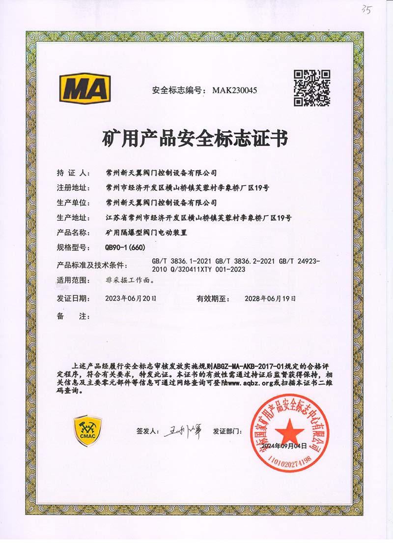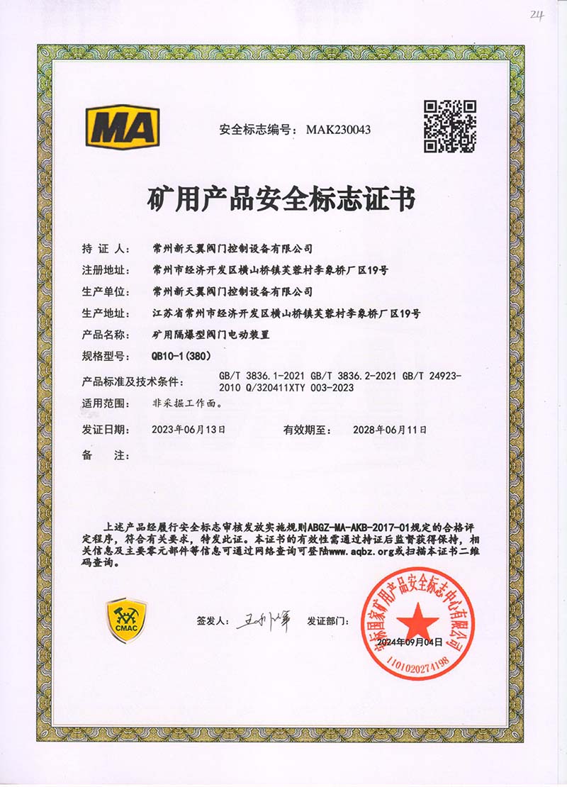 礦用產品安全標志證書QB20-1(380)